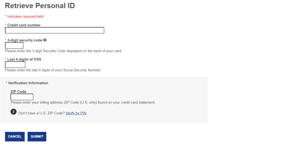 - You will need to enter your Credit card number, 3-digit security code, and the Last four digits of your SSN & ZIP Code to retrieve your personal id.